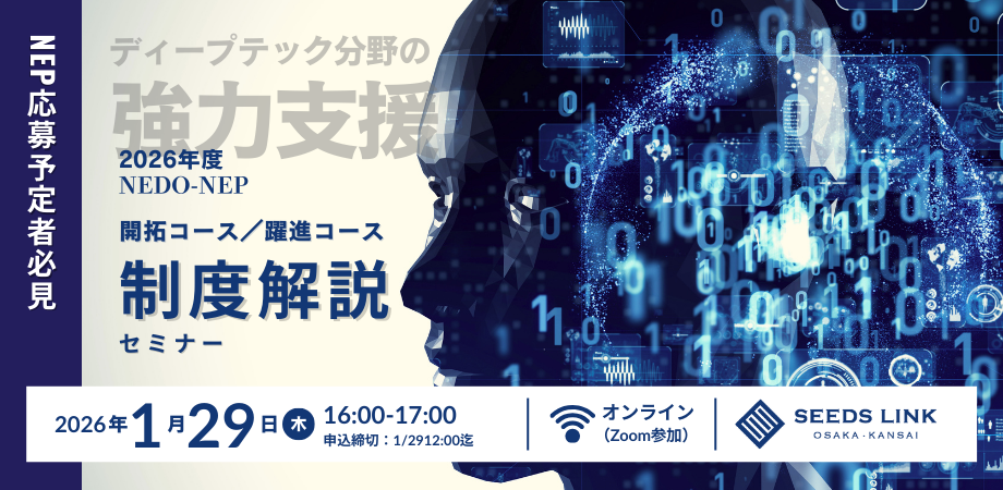 本セミナーでは、NEDOスタートアップ支援部NEPチームより講師を迎え、「研究開発型スタートアップの起業・経営人材確保等支援事業/ディープテック分野での人材発掘・起業家育成事業(NEP)」における「開拓コース」、「躍進コース」の制度概要から実際の支援内容までをわかりやすく解説します。