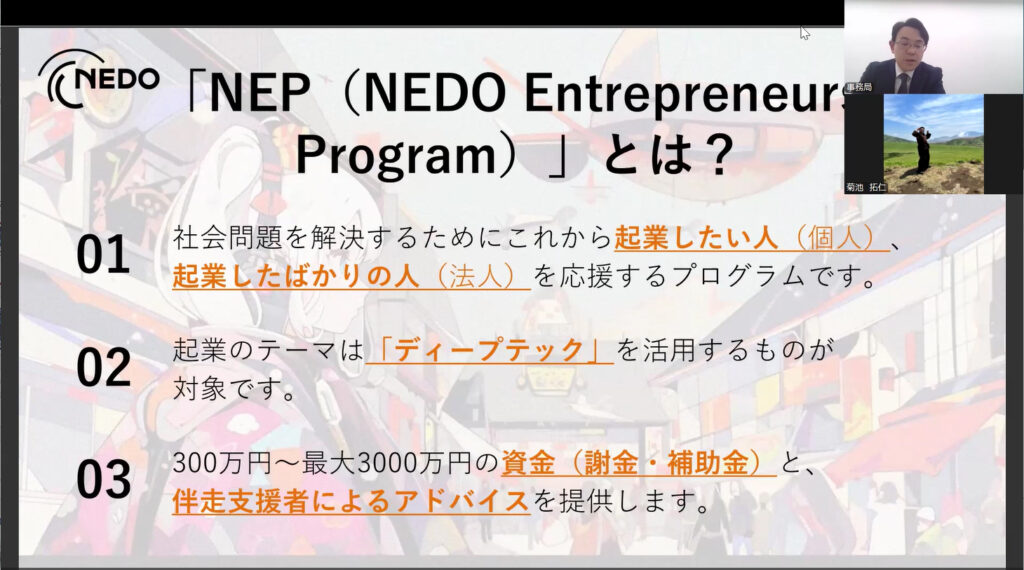 本セミナーは二部構成で実施され、第1部では新エネルギー・産業技術総合開発機構(NEDO)スタートアップ支援部NEPチームより講師を迎えた制度紹介セミナー、第2部ではNEP「開拓コース」採択者とのトークセッションが行われました。