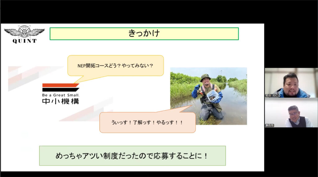 その一方で、事業化に取り組む以上は「覚悟と責任を持ってチャレンジする必要がある」という話もありました。NEPの支援資金は公的資金であり、税金を原資としていることから、その重みを意識することが大切だという点が率直に語られました。
